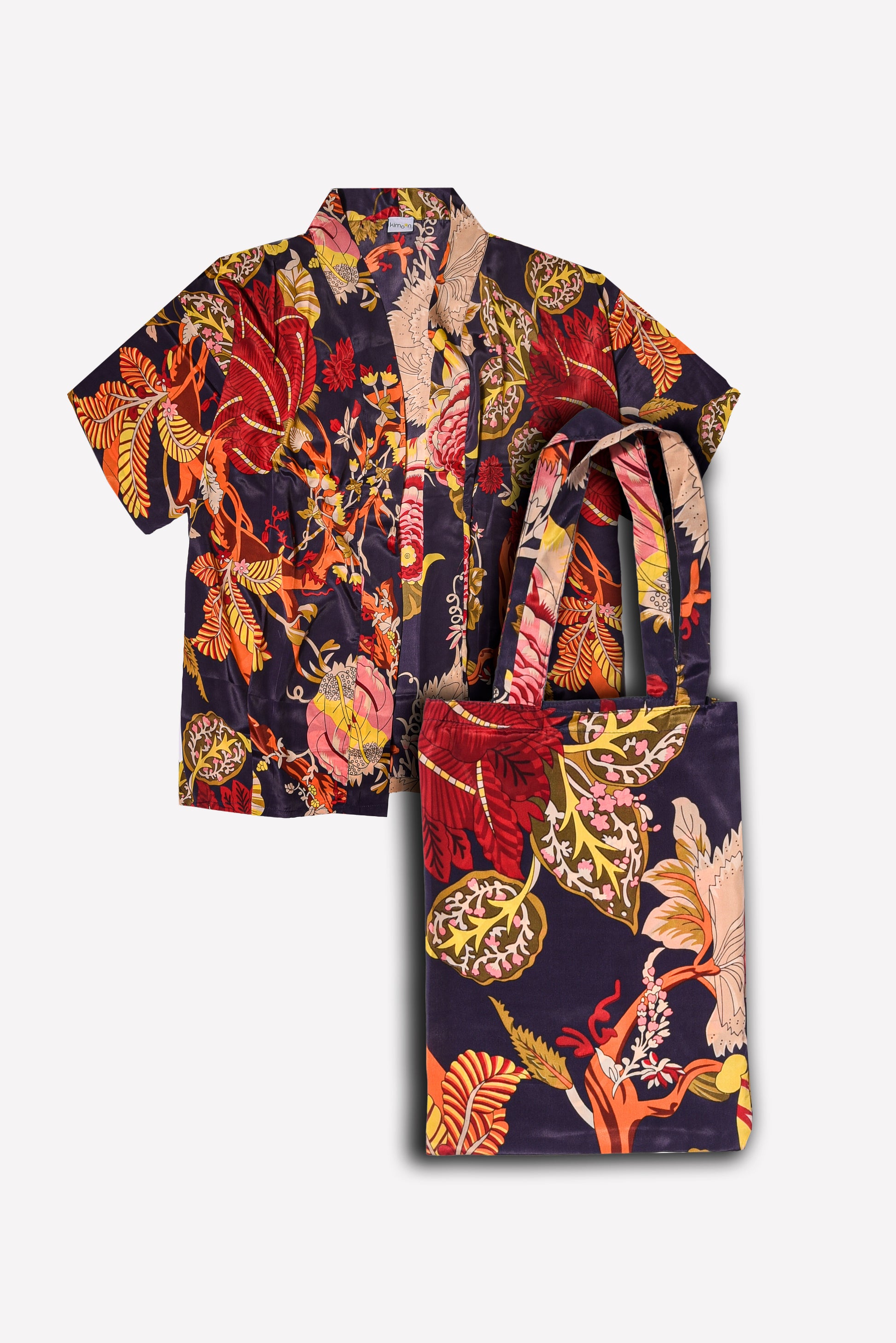 Aggiungi un tocco di vivacità e comfort al tuo guardaroba con questo kimono a manica corta oversize, perfetto per completare un look minimal, oppure per aggiungere un accento sofisticato ai tuoi outfit quotidiani. Realizzato con materiali pregiati e un packaging che lo rende perfetto anche come idea regalo, ogni kimono viene fornito con una borsetta abbinata nello stesso tessuto e fantasia, per un tocco di stile extra e una scelta ecologica.