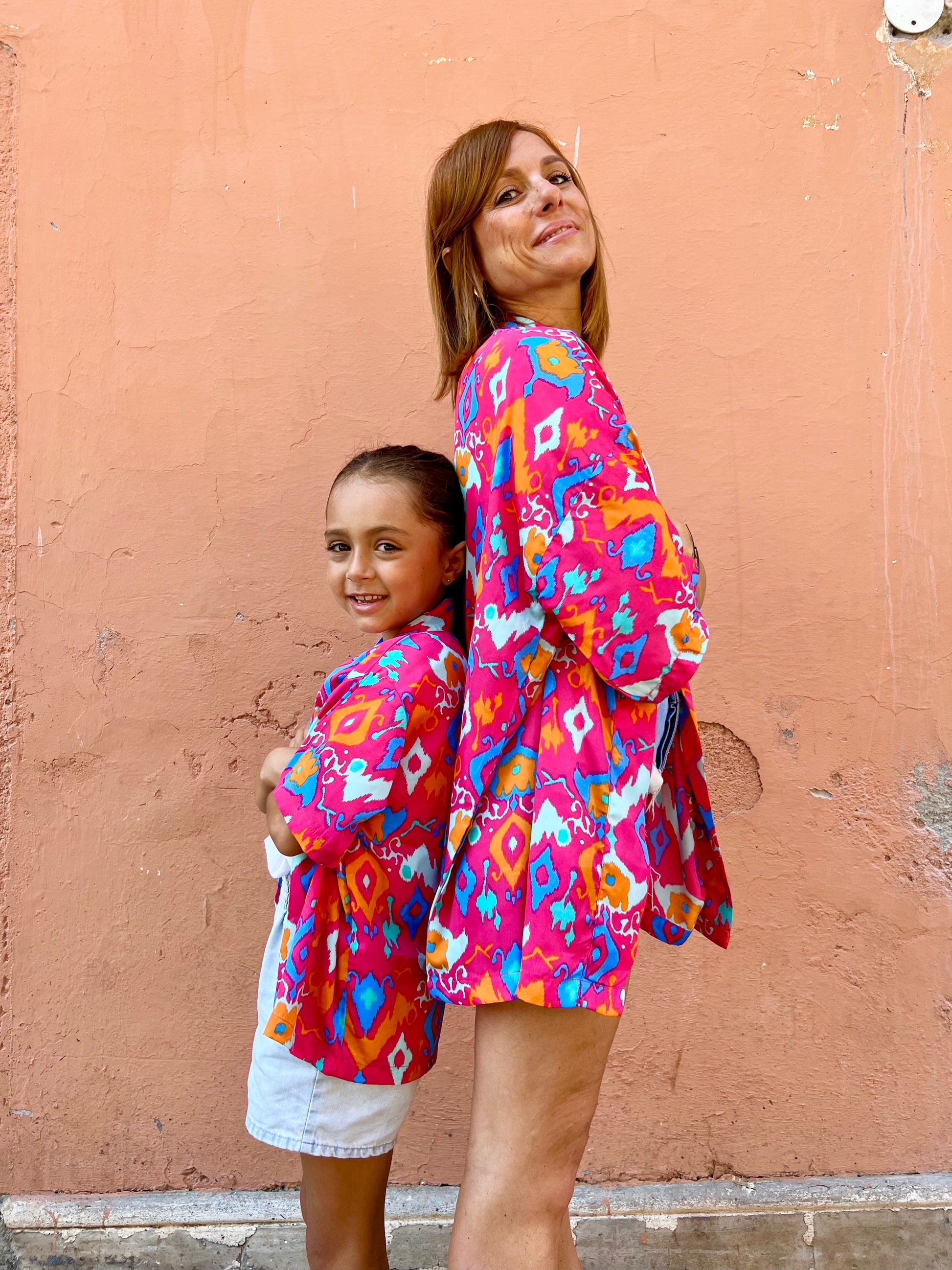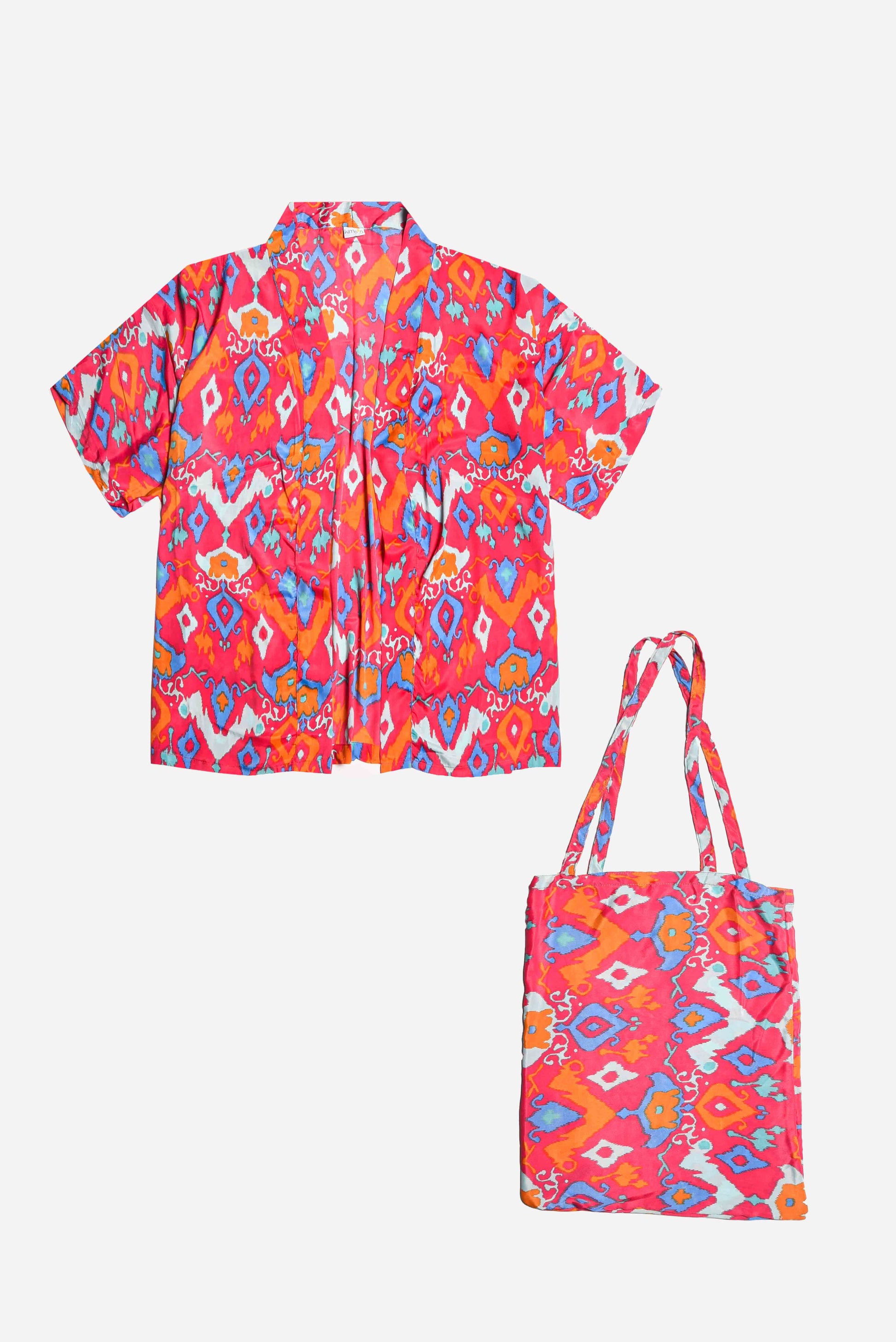 Aggiungi un tocco di vivacità e comfort al tuo guardaroba con questo kimono a manica corta oversize, perfetto per completare un look minimal, oppure per aggiungere un accento sofisticato ai tuoi outfit quotidiani. Realizzato con materiali pregiati e un packaging che lo rende perfetto anche come idea regalo, ogni kimono viene fornito con una borsetta abbinata nello stesso tessuto e fantasia, per un tocco di stile extra e una scelta ecologica.