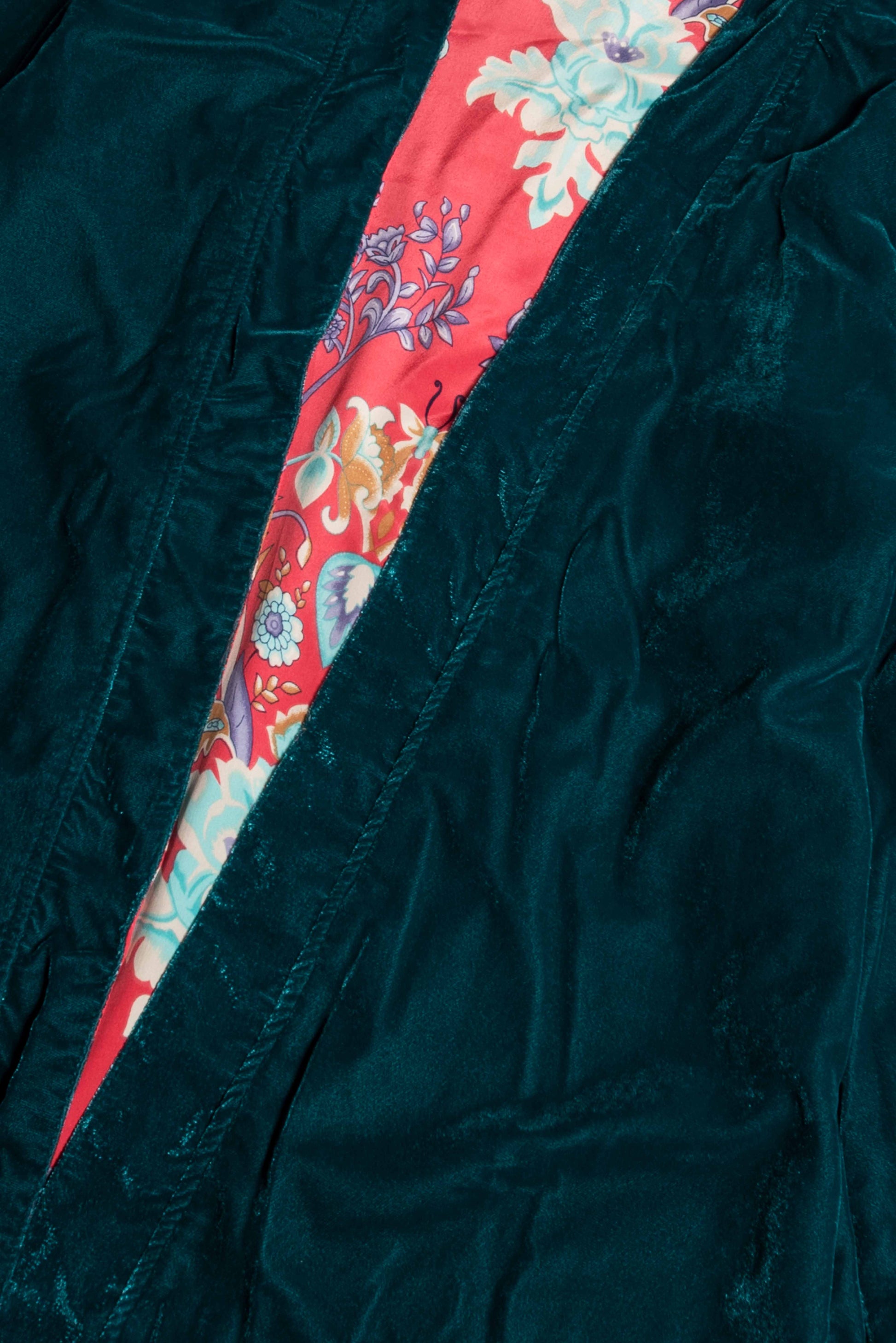Lati: velluto verde tinta unita / seta stampata corallo.